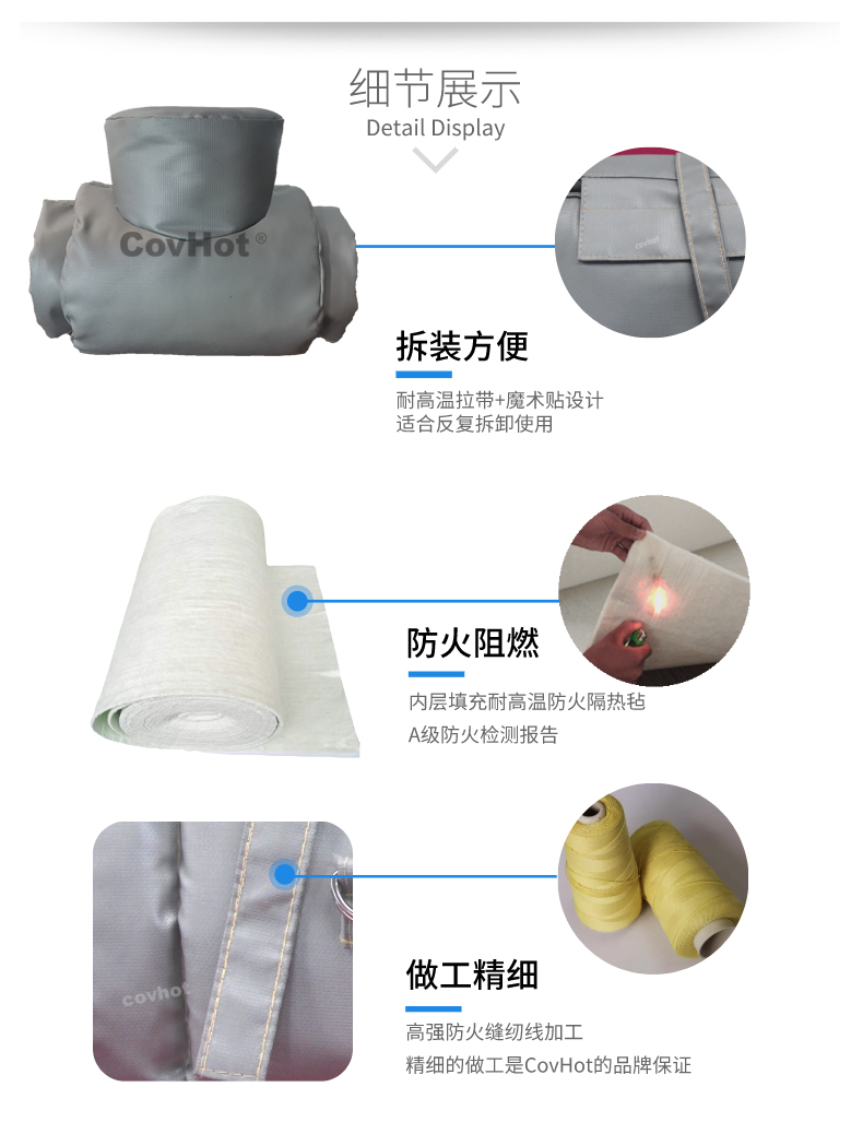 閥門內部介質通常為各種化工原料,柔性可拆卸閥門保溫套使用的材料可防火阻燃,能夠有效防止因介質泄露引起的火災 ,另外閥門運行時溫度較高,易受熱膨脹,“披覆保溫”原材料柔韌性較好,能夠對閥門的膨脹進行補償,不會出現保溫性能下降現象,有利于閥門機組安全運行,大大提高設備運轉率,增加經濟效益;