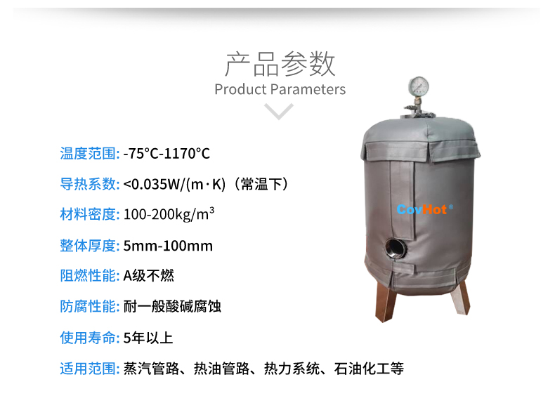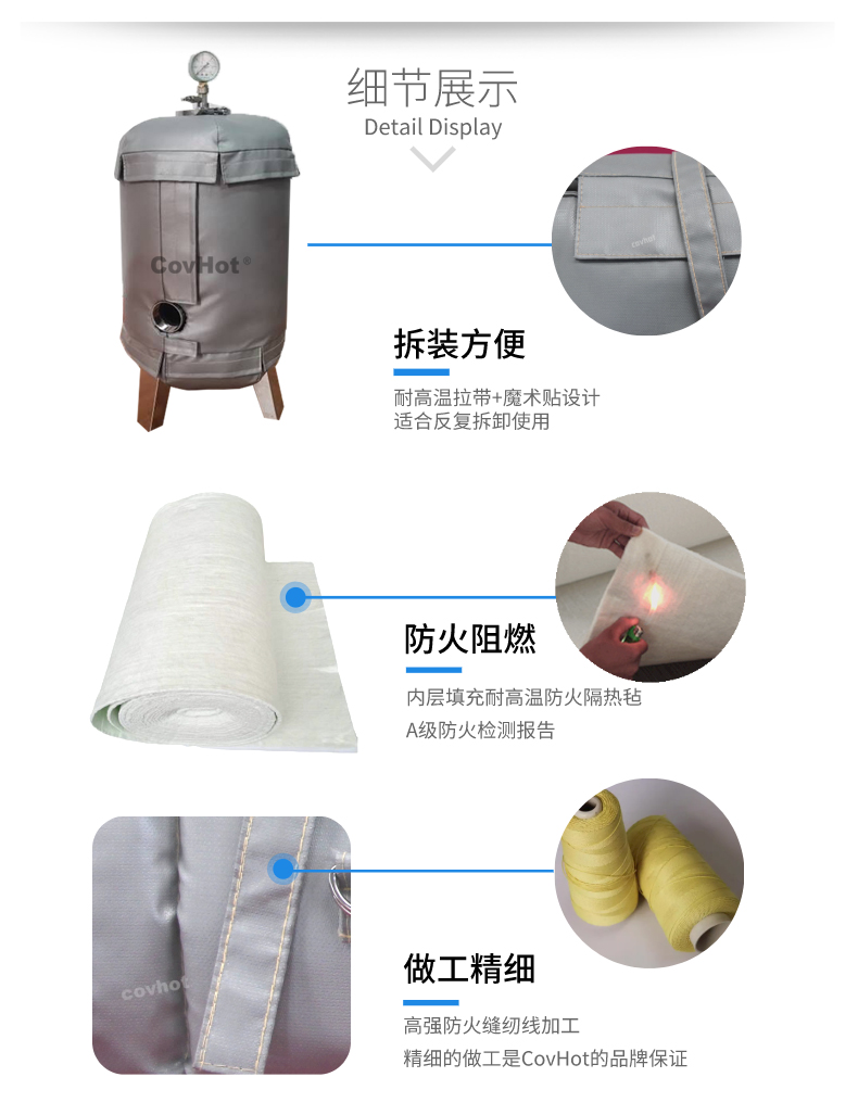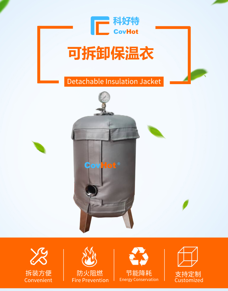柔性可拆卸保溫套根據(jù)熱力設(shè)備外形尺寸量身定制,與設(shè)備緊密貼合,整潔美觀,保溫材料導(dǎo)熱系數(shù)低,安裝拆卸方便。