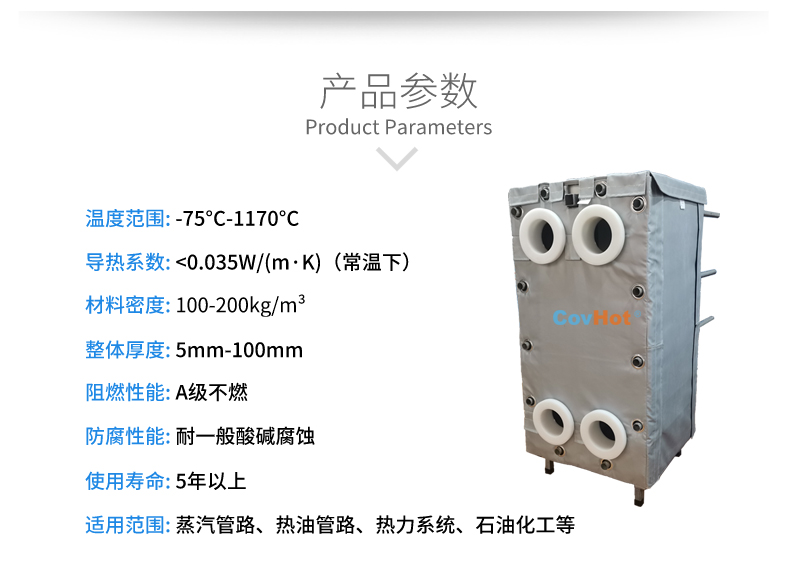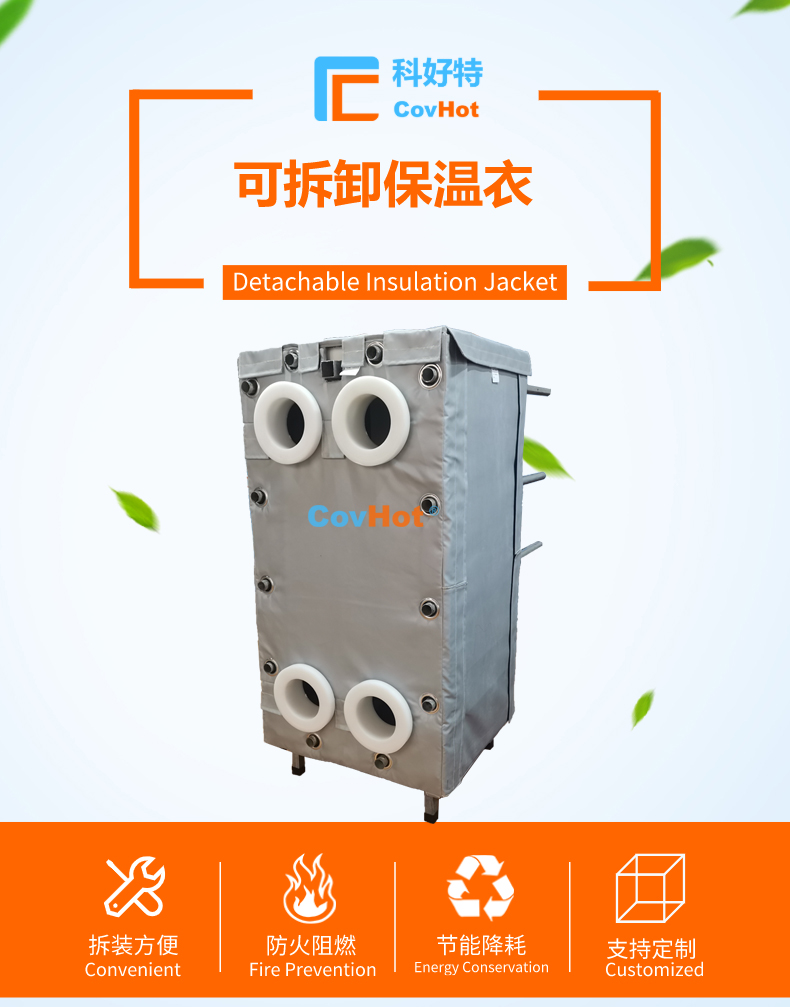 針對(duì)以上的問(wèn)題,河北科好特科技有限責(zé)任公司自主研發(fā)的節(jié)能型板換保溫衣,可以有效減少換熱器的熱量損耗,而且在施工過(guò)程中安裝拆卸方便,節(jié)省人工,可拆卸保溫衣還可重復(fù)使用,起到節(jié)能降耗的效果??坪锰?a href=http://www.1yan.net/e/tags/?tagname=%E5%8F%AF%E6%8B%86%E5%8D%B8%E4%BF%9D%E6%B8%A9%E8%A1%A3 target=_blank class=infotextkey>可拆卸保溫衣根據(jù)設(shè)備不同的尺寸形狀量身定制,可廣泛用于換熱器、閥門(mén)、管道及其它需要保溫或防凍的領(lǐng)域。