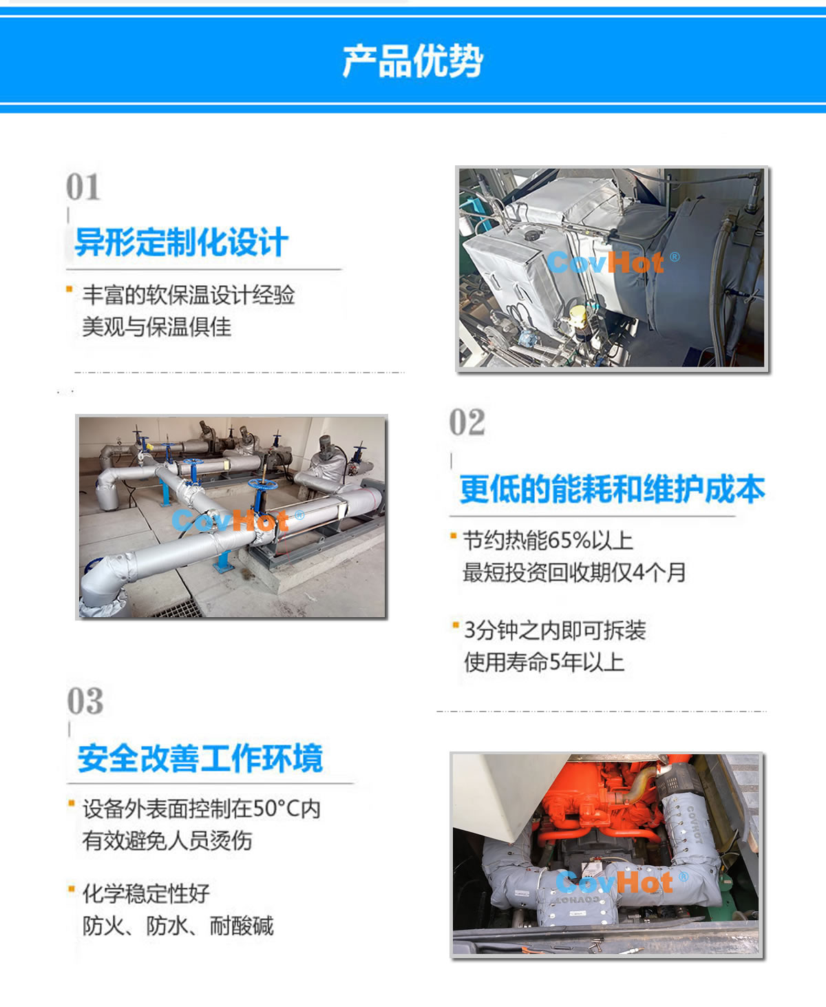 硫化機可拆式保溫衣具有節能降耗、提高生產效率、維持設備恒溫、降低環境溫度,改善生產車間環境溫度等作用。不僅如此,硫化機可拆式保溫衣,還能夠反復拆卸使用,方便設備檢修維護,能夠大大減少設備檢修維護時所耗費的時間,從而提高生產效率。